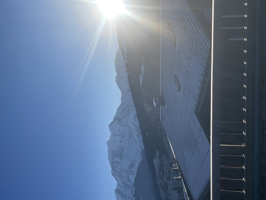 The image depicts a panoramic winter landscape viewed from an elevated position in Combloux, France, under a clear blue sky. In the foreground, a dark wooden balcony railing with vertical balusters runs horizontally across the bottom third of the frame, casting distinct, elongated shadows on a lower surface. Directly behind the railing, in the midground, is the snow-dusted, corrugated metallic roof of a building, oriented diagonally. A stone chimney with a snow-capped hood is visible on this roof, along with two rectangular skylights, also partially covered in snow. Further down the slope, a village or townscape with multiple buildings and scattered trees is visible, partially obscured by a hazy atmosphere, indicative of the Combloux valley. In the background, majestic snow-capped mountains, including Mont Blanc and its surrounding massif, dominate the horizon. The sun is positioned in the upper right quadrant, emitting a bright, intense glare and distinct lens flares, illuminating the scene from the right and creating strong contrast and long shadows. The sky is uniformly clear and blue. No people or animals are present.