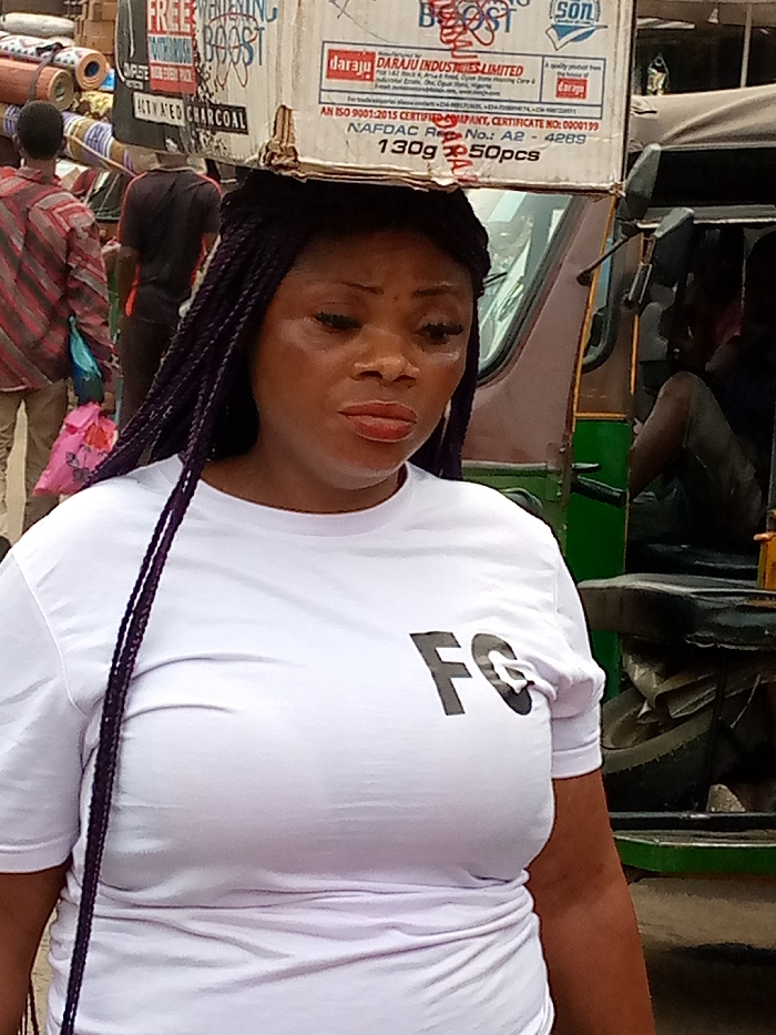 The image captures an outdoor street or market scene in Aba, Nigeria, under daylight conditions