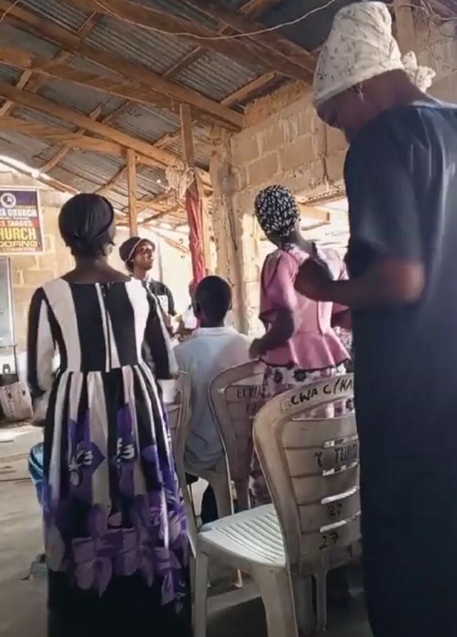 Captured from a low angle, the video shows an interior scene with several individuals in a church-like setting. The church has a corrugated metal roof supported by wooden beams. People are standing, with their backs to the camera, in a semi-circle arrangement. One woman is wearing a black and white striped dress with purple floral patterns; another is in a pink peplum top and floral skirt. The man closest to the camera is dressed in black and has a patterned headscarf. Seated in the center is a man in a white shirt. One person appears to be leading a hymn or song. White plastic chairs are scattered around, some with writing on the back. A poster is attached to the wall, partially obstructed by a red curtain. The room looks old and unkempt.