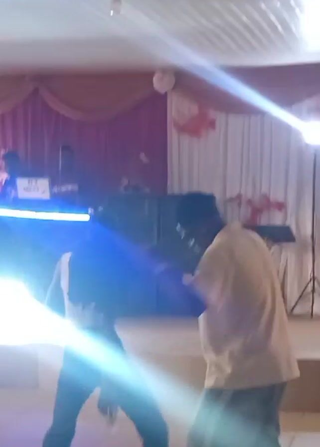 two people dancing on a stage. The person on the left is wearing a white top and jeans. The person on the right is wearing a yellow shirt and pants. They appear to be playfully hitting at each other while moving to the music. The stage is decorated with red curtains. Behind the dancers, there is a DJ booth with the name “DJ MIZZY” on it. Other people are standing near the edge of the stage. The room has a white, paneled ceiling with lights and ceiling fans. The floor is tiled.