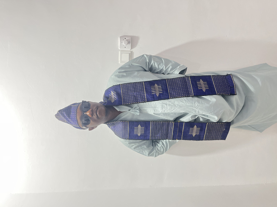 In an indoor setting in Joma, Ghana, a male individual stands against a plain white wall. He is positioned centrally, facing directly forward. The individual wears black rectangular sunglasses, a light blue long-sleeved tunic (agbada style) with a light blue tassel at the V-neck, a blue patterned conical hat (fila), and a long blue patterned scarf or stole draped over his shoulders. The scarf features intricate geometric patterns including horizontal silver/white bar-like motifs. His hands are not visible. On the white wall to the right of the individual, two white electrical fixtures are visible: a rectangular light switch and a circular dial, likely a dimmer switch or thermostat. The lighting is even and consistent with an interior environment.