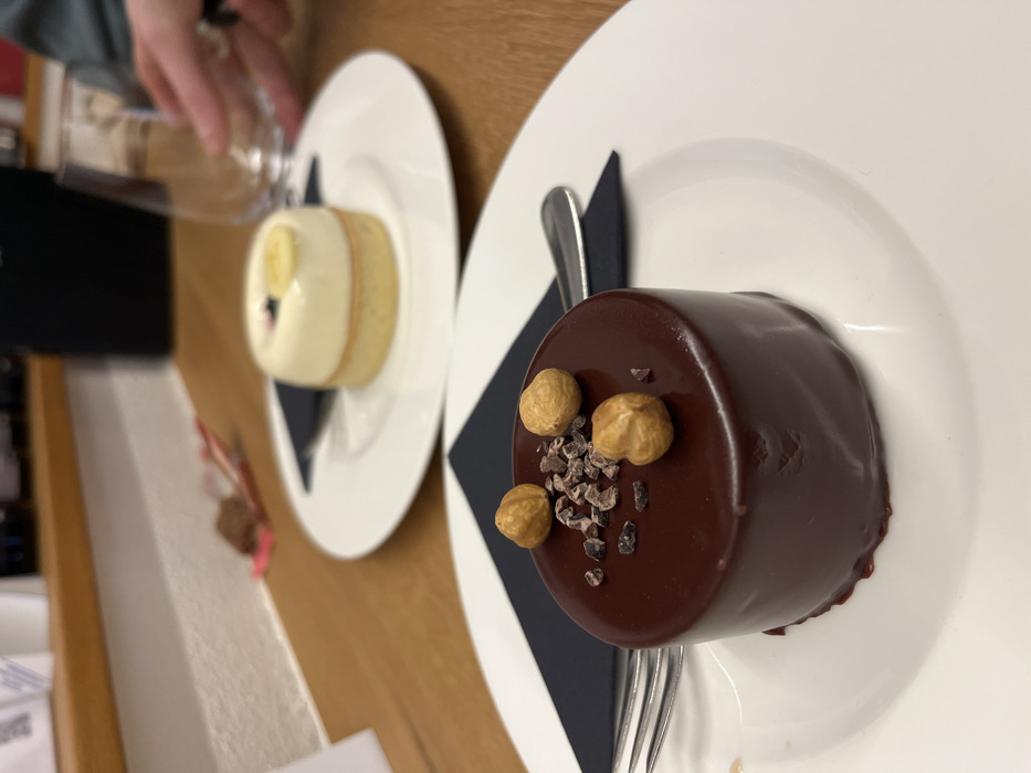 Two desserts sit on white plates with black napkins. The closest dessert is a dark chocolate cylinder, adorned with three hazelnuts and cocoa nibs. A fork rests beside it on the napkin. The other dessert is lighter in color, featuring white frosting with a slice of fruit and visible layers. Both plates are placed on a wooden surface. Part of a hand holding a glass is visible near the lighter dessert.