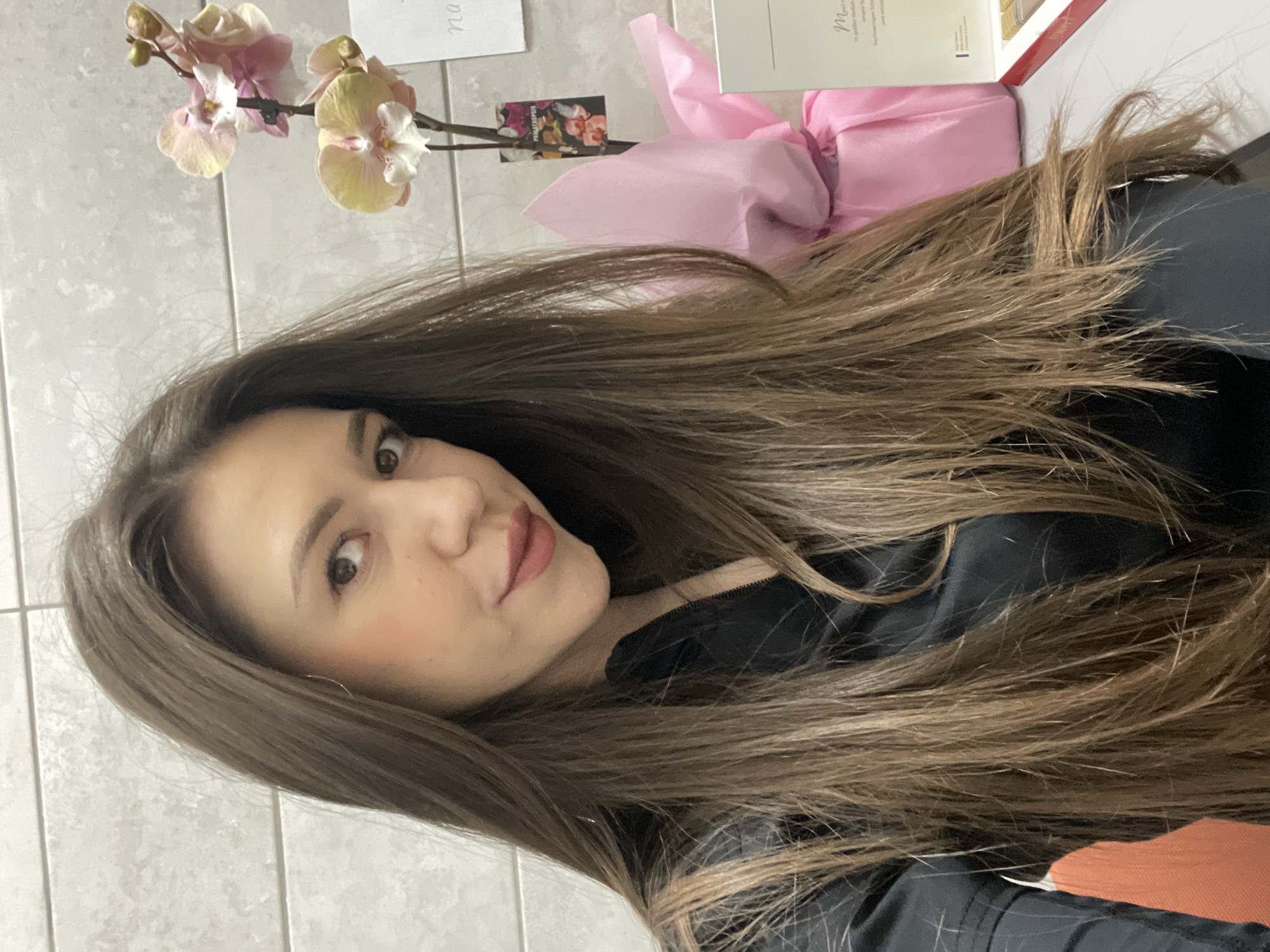 A woman with long, brown hair is centered in a close-up shot, posing with a slight smile. Her eyes are light brown, and she wears light makeup. She is dressed in a black garment. The background features a tiled wall, a pink and white orchid, a small floral card, a pink tissue paper, and a book or box with text on it. The location cannot be determined.