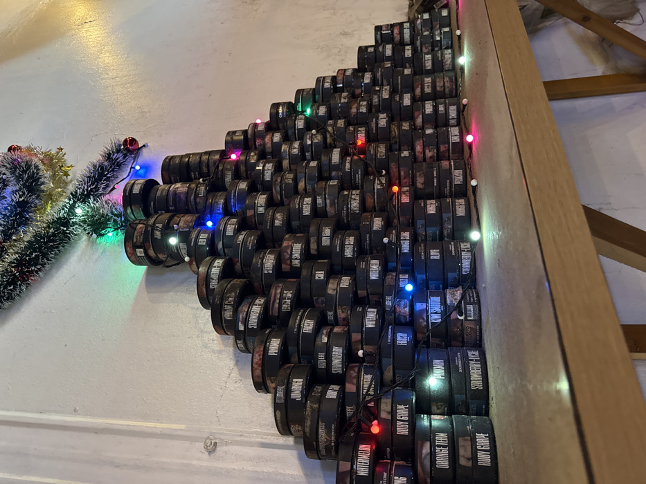 Within an establishment located in Ngũ Hành Sơn Ward, Vietnam, a substantial display consisting of numerous small, dark-colored, cylindrical tins is arranged in a pyramid formation on a light-colored wooden counter. The tins, approximately two hundred in number, bear white text labels identifying various flavors or product types, including "WATERMELON," "RUBY GRAPE," "ORANGE TEAM," "JUMANGO," "PINKMAN," "FROSTY," "VANILLA CREAM," "STRAWBERRY-LYCHEE," "LEMON-LIME," "KIWI SMOOTHIE," "MANGO SLING," "BLOVD," and "CHERRY." A string of multi-colored LED lights (red, green, blue, white, and magenta) is draped over the stacked tins and extends along the front edge of the wooden counter. Above the tin display, a segment of green, silver, and gold tinsel garland, also adorned with multi-colored lights, is affixed to a plain, light-colored wall. No individuals are present in the scene.