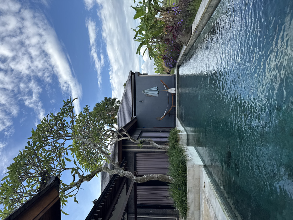 A tranquil scene reveals a sleek, modern house nestled beside a long, narrow pool. A lush tree with delicate leaves frames the structure. The house's dark exterior contrasts with the bright sky streaked with clouds. Greenery and colorful flowers adorn the edge of the pool, while a parasol and lounge chair rest on the house’s patio. The water's surface reflects the sky and the building creating a serene and inviting atmosphere.