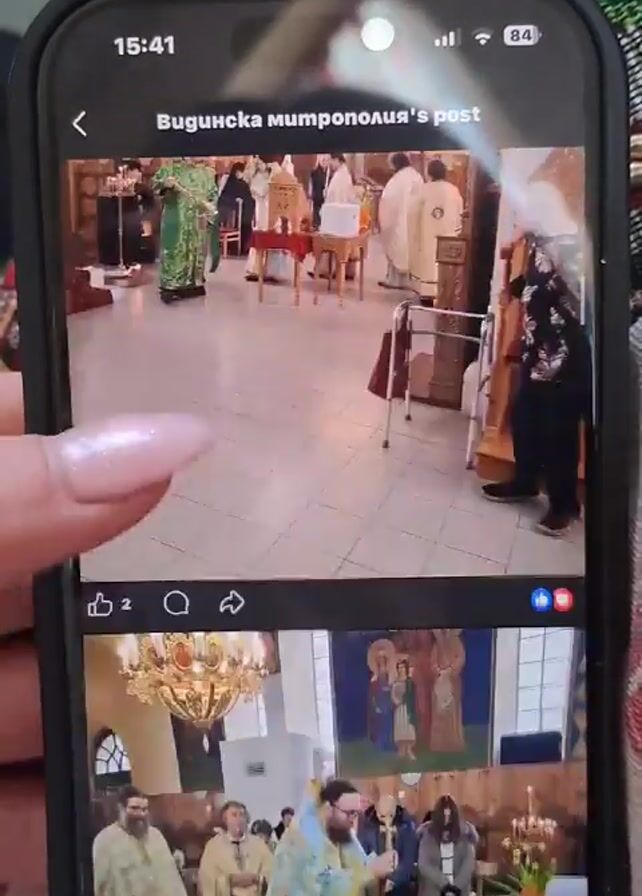 someone holding a smartphone and scrolling through a social media post by Видинска митрополия. The post contains multiple images of the interior of a church. Several priests are seen in their liturgical vestments performing a service. There are also images of religious icons adorned with flowers and a cross. People are present in the church. The environment is ornately decorated, with visible paintings and chandeliers. The smartphone screen displays social media interface elements such as like counts, comment options, and the name of the user who posted the content.