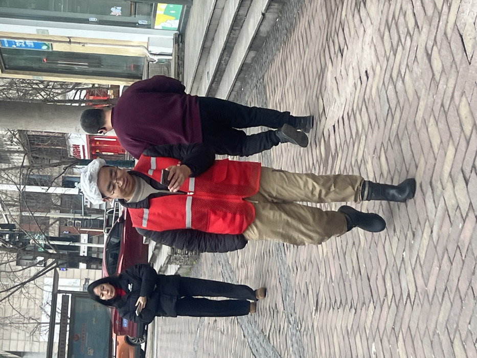 Three individuals stand on a brick-paved sidewalk. The person in the middle wears a red vest, light brown pants, black boots, a hairnet, and glasses, looking at a mobile phone. Behind them, a person in a burgundy sweater and black pants walks away. In front of them, a person in a black jacket and black pants looks at their own phone. A vehicle is parked nearby.