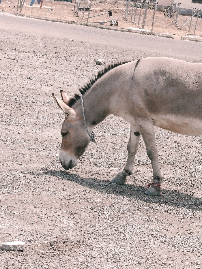 - "A light-colored donkey with a black mane and dorsal stripe stands on dry, gravelly ground, its head lowered towards the earth" by FM-APQyk2, licensed under CC BY 4.0