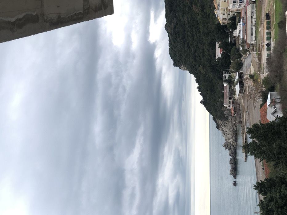 The image displays an overcast coastal panorama in Čanj, Montenegro