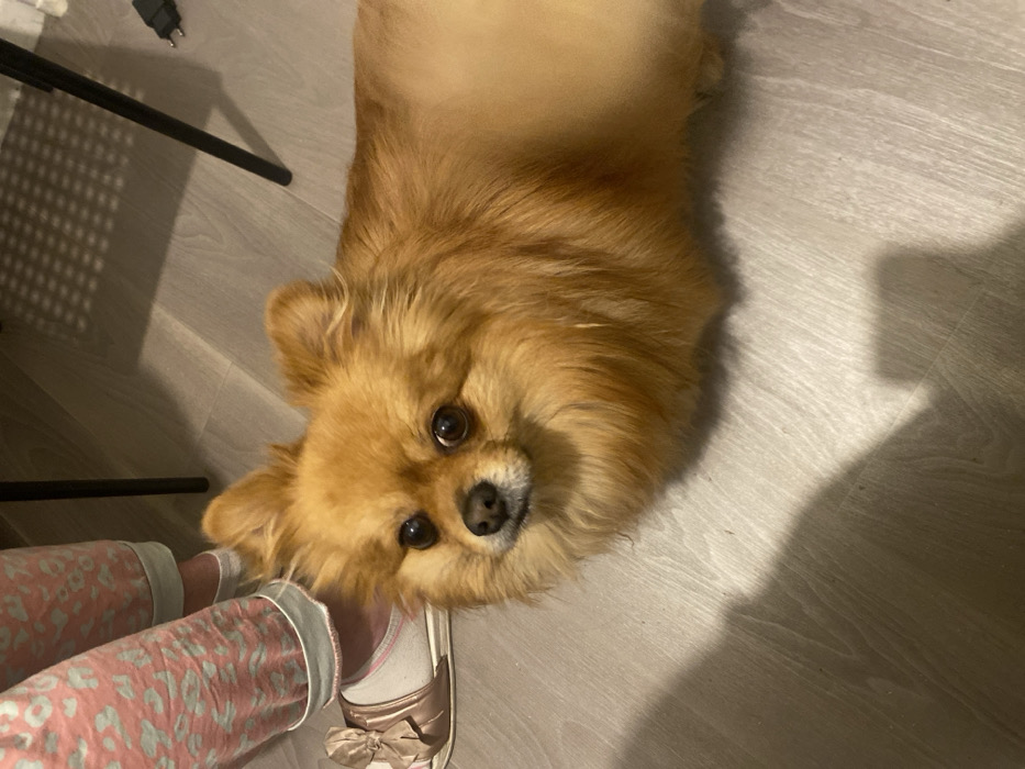 In an indoor setting in Oberhausbergen, France, a small, reddish-brown dog with fluffy fur around its head and a partially shaven body faces the camera directly, its dark eyes prominent. To the left of the dog, the lower legs and feet of a person are visible. The person wears light pink pajama pants with a patterned design and light blue cuffs, white socks, and a light pink flat shoe adorned with a large bow. Two black metal chair legs are present in the background, along with a black electrical plug on the light-colored wooden or laminate floor. Distinct shadows are cast on the floor.