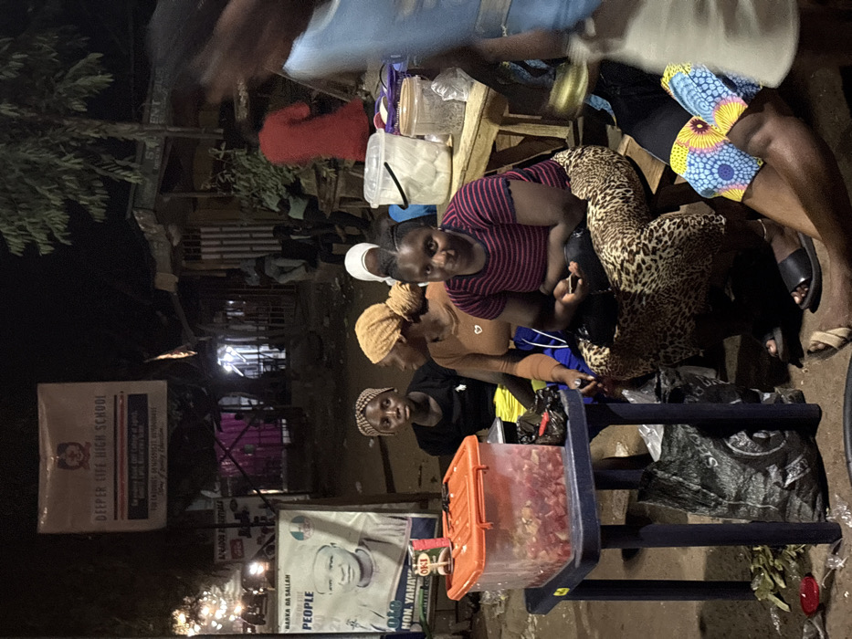Three women gather behind a refreshment cart, containing an orange container, alongside a political campaign poster with the words "MARKA DA SALLAH PEOPLE" and a Deeper Life High School sign. The street scene includes bystanders and a building in the background. The scene is dimly lit. The attire worn by the women is diverse with patterned fabrics.