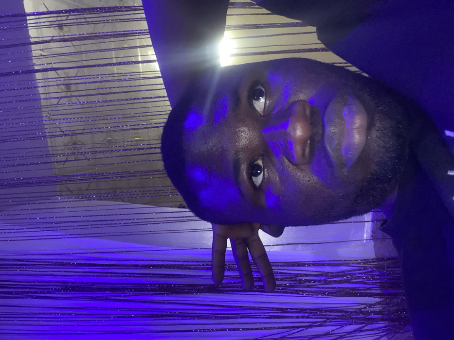 A man is pictured against a backdrop of shimmering, string-like decorations illuminated in vibrant blue. His face dominates the frame, exhibiting a mix of light and shadow. His dark complexion contrasts with the bright light reflecting in his eyes. Three fingers extend downward, almost touching a surface with similar string decorations. The photo is taken at an odd angle, slightly tilted to the side.