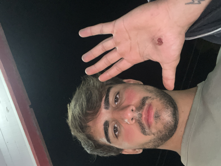 A man displays a hand with a visible wound on the palm. He gazes directly at the camera. The man has brown hair, a beard, and slightly flushed cheeks. A tattoo is partially visible on his wrist. The background appears dark, suggesting an outdoor setting at night. A red and white object is seen in the lower-left corner. He is wearing a light-colored shirt.