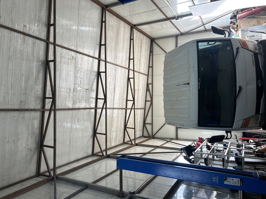 The image displays the interior of a vehicle repair garage or workshop located in Byala, Bulgaria. The structure consists of an exposed metal framework supporting a light-colored, corrugated panel roof and vertical walls. A white Nissan Cabstar commercial truck is positioned centrally, facing the viewer, with its front windshield, grille, and headlights visible. To the left, a blue two-post vehicle lift, labeled with "CE" and "4,000kg" capacity, stands unoccupied. Behind the lift, a multi-tiered metal shelving unit holds assorted automotive parts and tools. Additional workshop clutter, including a chair and what appears to be a white board, is visible to the right of the truck. No individuals are present in the scene.
