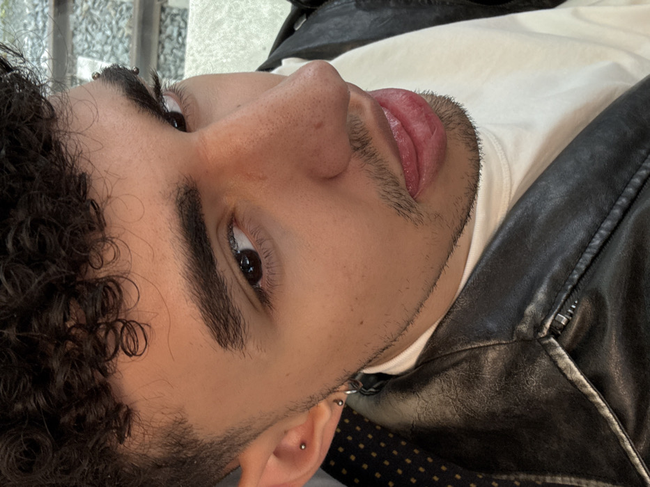The image presents a close-up portrait of a single individual, a young adult male, seated within what is identifiable as a train carriage. The subject has dark, curly hair, dark eyes, prominent dark eyebrows, and a light to medium skin tone with visible stubble across his chin, jawline, and upper lip. Piercings include a silver stud in the upper helix of the left ear, a small silver hoop in the left earlobe, and a silver barbell piercing positioned above his left eyebrow. He is dressed in a black leather jacket with a zippered lapel, worn over a plain white or off-white crewneck shirt. The subject's head is slightly tilted, and his mouth is partially open with the tongue slightly protruding. The immediate background on the left reveals a patterned, upholstered seat, characteristic of public transport. The background on the right, beyond the subject's head, is blurred, showing what appear to be railway tracks and ballast, viewed through a window. The overall scene is consistent with a person traveling by train, plausibly within or en route to/from the railway infrastructure associated with Sankt Moritz, Switzerland.