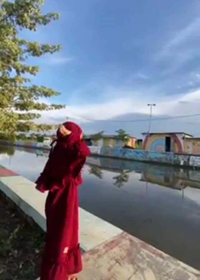 A child wearing a red hijab and matching dress stands on a concrete ledge next to a canal or river. The child faces the water and at first extends one arm towards the water then brings it back to her side. She smiles at the end of the video. Across the water there are small buildings painted with colorful murals. The sky is bright blue with scattered clouds and the video is taken outdoors in daylight.