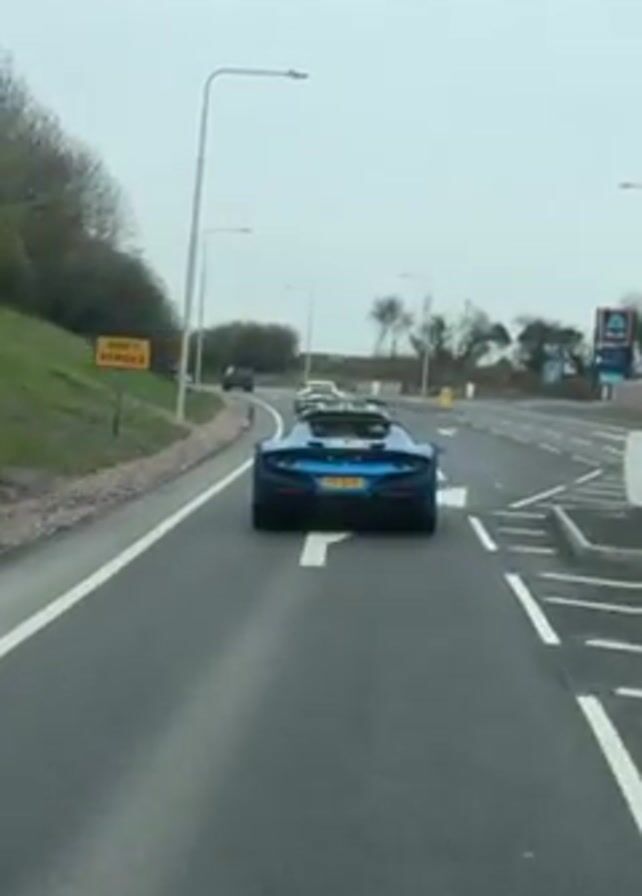 line of luxury cars driving on a grey asphalt road. The camera is positioned in a car following behind them. The first car, closest to the camera, is a blue convertible with the license plate F8 DYU. Following closely behind are two more convertibles, and a white Porsche. There is grass on the left side of the road and trees, and on the right side of the road is a sign for Aldi. It is a cloudy day.