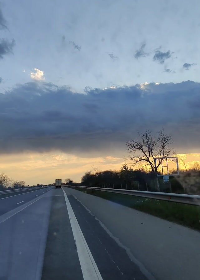 view from the inside of a car driving on a highway during a sunset. The sky is a mix of light blue and dark grey clouds, with the setting sun casting a warm yellow glow. On the right side of the road is a metal guardrail, beyond which lies a strip of trees and vegetation. A large truck can be seen in the distance on the left side of the road. The dashboard of the car is visible at the bottom of the frame. There is music playing.