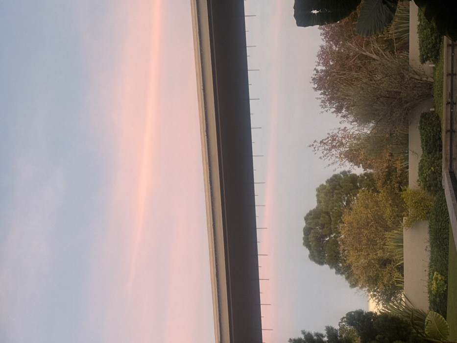 A view from a window shows a sky with pink hues. A dark, linear structure with small, evenly spaced protrusions bisects the image. Outside the window, various trees and green foliage create a dense border on the right. The color of the sky changes from light blue to pink.