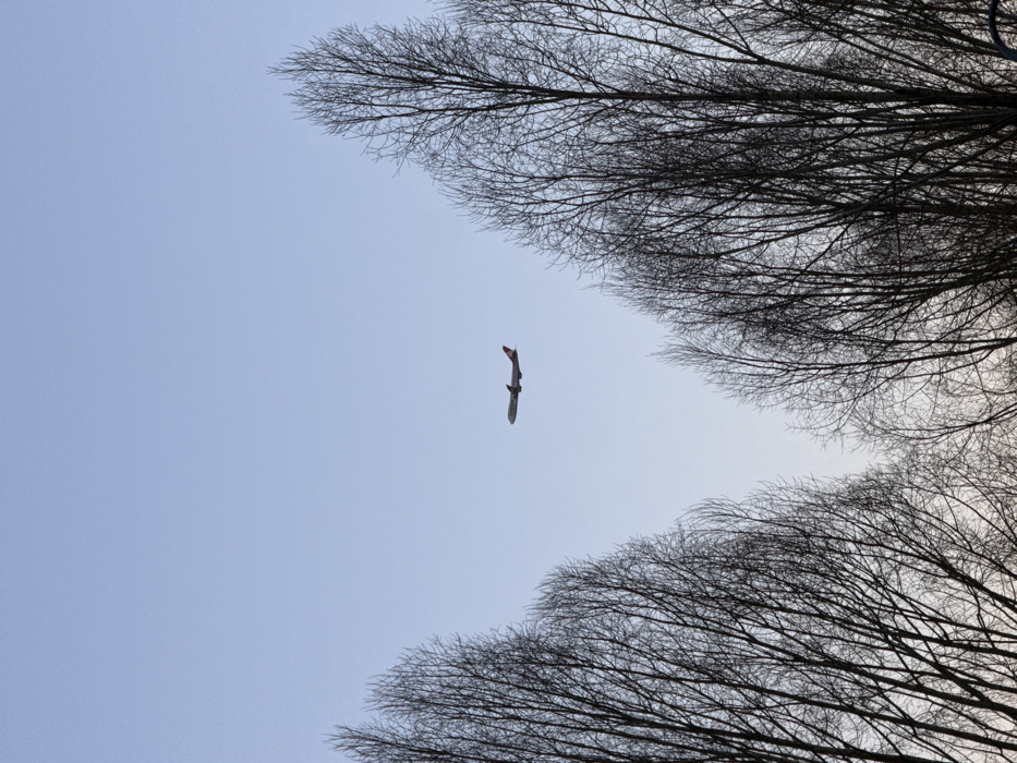 This image depicts an outdoor scene over Junglinster, Luxembourg. The upper two-thirds of the frame display a clear, light blue sky. Below, two prominent formations of deciduous trees, bare of leaves, frame the lower portion of the image. Their dark, intricate branches create a natural, upward-pointing V-shape in the center. A single commercial airliner, predominantly white with a distinctive red tail and red accents on its fuselage, is visible in the mid-upper sky. The aircraft is flying horizontally from left to right at a cruising or climbing altitude, consistent with a flight path to or from Luxembourg Airport. No individuals, ground features, or other objects are discernible in the scene.