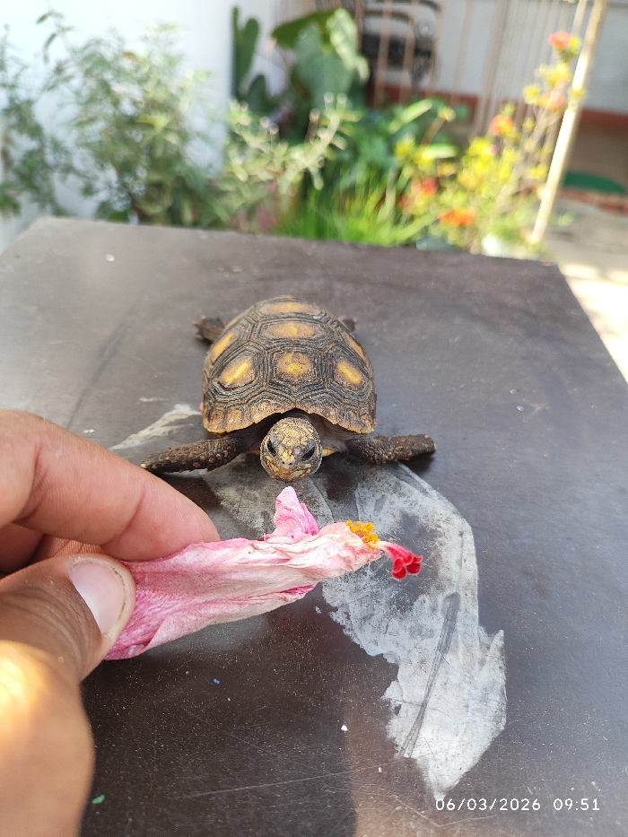 This image, taken in Tinaquillo, Venezuela, on March 6, 2026, at 09:51 AM, depicts a small tortoise on a dark, flat surface. The tortoise, likely a juvenile, has a brown carapace with prominent yellowish-orange scutes and is positioned centrally, facing forward with its head extended. To the lower left, a human left hand with a medium-dark skin tone is visible, holding a light pink flower petal. The petal, which appears to be from a hibiscus, features yellow pollen and a red pistil/stigma at its tip, and is presented horizontally towards the tortoise's head. The dark surface beneath the tortoise exhibits lighter grey smudges and linear marks, suggesting wear or dust. The background is out of focus, showing lush green foliage, some reddish-orange flowers, and a tall cactus, indicating an outdoor, possibly garden or patio, setting. A white wall and part of a metal gate structure are faintly visible on the right side of the background.
