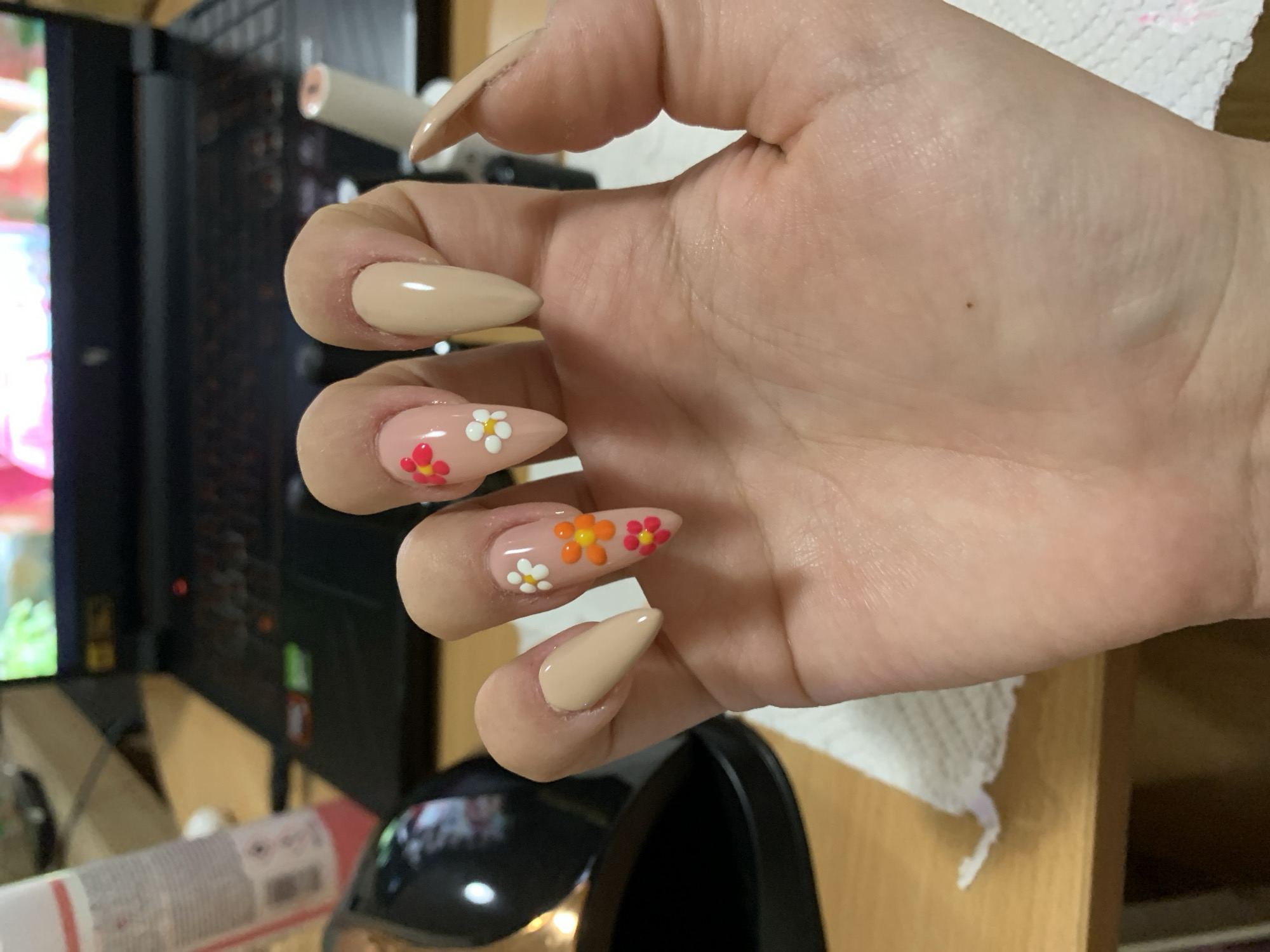 A close-up shot shows a right hand with pointed, almond-shaped fingernails. Two nails are painted a solid beige color. The other two are painted with pinky nude color with floral designs. One nail features red and white flowers, while the other features orange and white flowers. The hand is resting on a wooden surface. A dark object with reflective surfaces is partially visible near the bottom of the frame. Behind the hand, there is a laptop, and some bottles. The location is unknown.