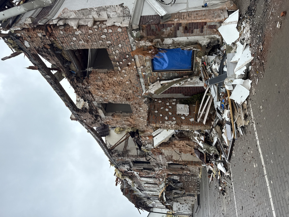 The image displays a severely damaged multi-story brick building located in Petropavlivska Borshchahivka, Ukraine