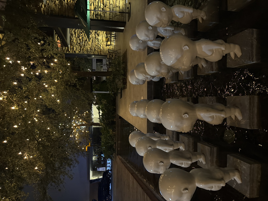 A nighttime view features rows of white, baby-like sculptures emerging from a water feature. The sculptures are evenly spaced and positioned horizontally. To the left, a tree adorned with twinkling lights adds to the ambiance. In the background, building exteriors and architectural details are partially visible. The scene is illuminated by artificial lighting, creating a contrasting play of light and shadow.