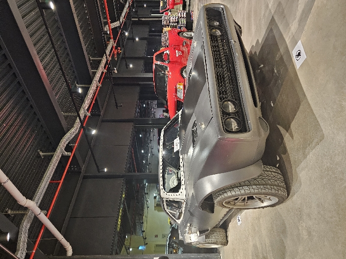 - "A matte grey custom-built vintage American muscle car, featuring a wide-body kit with prominent fender flares, quad circular headlamps, and a black mesh grille, is prominently displayed indoors in Reckange-sur-Mess, Luxembourg" by FM-n22Rc2, licensed under CC BY 4.0