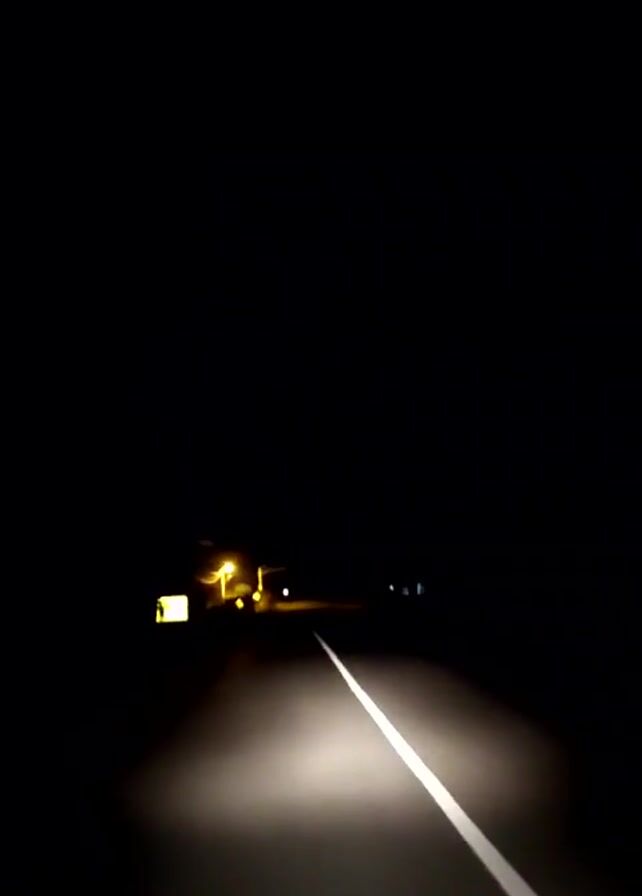 A car drives down a dark road at night, illuminated by its headlights