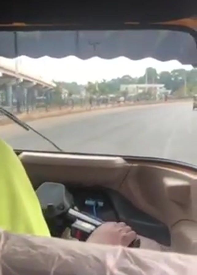 ride in a yellow auto rickshaw in what appears to be an urban or suburban area. The camera is positioned inside the rickshaw, offering a view through the windshield. We see the road ahead and other auto rickshaws driving in the same direction. A person, possibly the driver, is partially visible, wearing a bright green shirt. The surroundings include trees, buildings, and an overhead structure. The video is relatively stable, indicating a smooth ride.