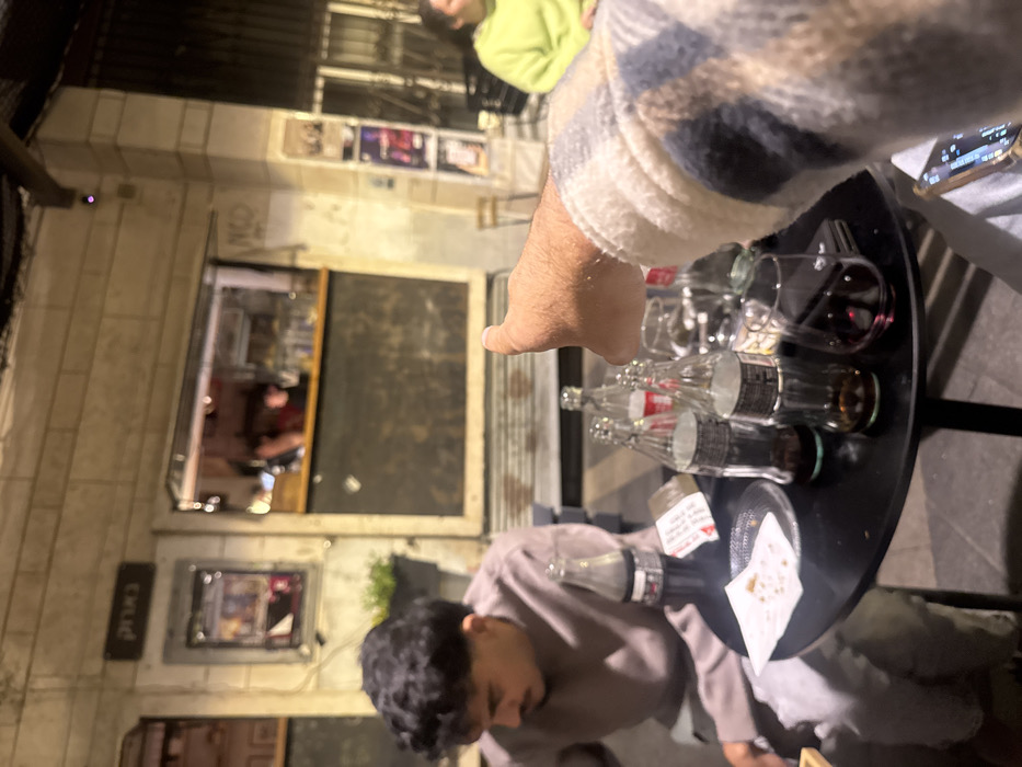 The image depicts an evening scene at an outdoor seating area of a bar or cafe located in the Nachalat Shiva neighborhood of Jerusalem, Israel. The establishment features a light-colored stone facade with a sign displaying the Hebrew word "בארוק" (Baroque) above a window. In the immediate foreground, the right arm of an individual, wearing a plaid jacket with cream and dark patterns, extends into the frame, with the index finger pointing towards the left. A smartphone is visible on this individual's lap. Seated at a round, black table to the left is a young adult male with dark hair and a mustache, wearing a light brown long-sleeved shirt, looking downwards and slightly away from the camera. The table holds several clear glass bottles, most appearing to be partially empty or containing dark liquid, along with a stemmed glass holding red liquid, and a white napkin with small food remnants. One bottle is lying horizontally on the table. In the background, another individual wearing a lime green top is partially visible, seated further to the right. Through a service window of the establishment, blurred figures are discernible inside. The building exterior features a dark, closed or shuttered panel below the service window, and posters are affixed to the stone wall to the right. A small potted plant is visible near the left side of the building's facade.