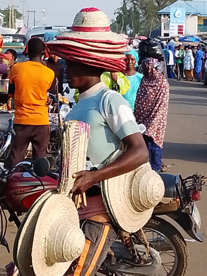 A man balances a stack of red and beige hats on his head while sitting on a motorcycle. He also carries more hats and woven mats or fans. He is wearing a light-colored shirt and dark pants with orange stripes. People, some in traditional attire, are milling about in the background. Other vehicles and market stalls are also visible. The scene appears to be in an outdoor market setting, possibly in Africa.