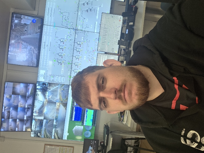 A male individual with short brown hair, a beard, and a mustache is depicted in a medium-shot selfie, positioned centrally in the foreground. He wears a black hooded sweatshirt over a black t-shirt with a red design and maintains a neutral expression, looking directly at the camera. The background reveals an industrial control room, identified as being within Devnya, Bulgaria, due to the nature of the operations depicted. Behind the individual, a large wall-mounted display system features multiple monitors. The top-left monitor displays a 16-panel grid of outdoor closed-circuit television (CCTV) feeds, showing various angles of industrial loading or storage areas. Below it, a middle-left monitor presents a 9-panel grid of similar outdoor industrial camera views. The bottom-left portion of the display, partially obscured, shows a graphical interface with green and blue data representations, likely indicating real-time process monitoring. The top-right monitor displays a single, wider CCTV feed of an indoor industrial environment, with a timestamp "02-05-2023 00:00:00" visible. A prominent, large multi-panel display across the center and right of the background presents a detailed schematic diagram of an industrial process, including multiple interconnected cylindrical structures (likely silos or tanks), flow lines, and control points, indicative of a Supervisory Control and Data Acquisition (SCADA) system for a large-scale manufacturing or processing plant. Desk surfaces with various electronic devices, including a black IP phone and a standard landline phone, are partially visible on either side of the individual. The environment is consistent with a 24/7 operational control center for heavy industry.