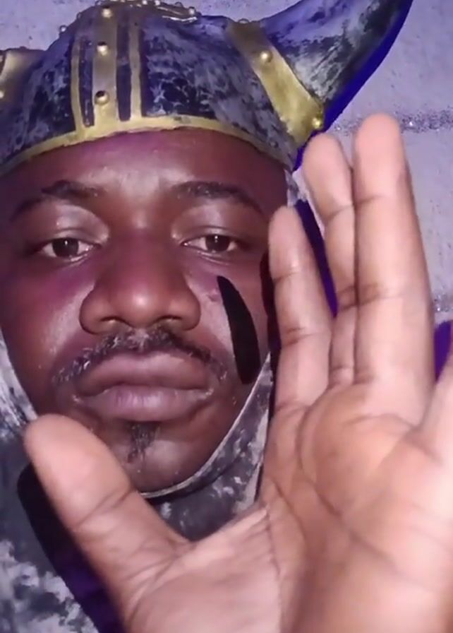 A man with dark skin wearing a Viking helmet, a hood, and dark makeup under his left eye is looking directly at the camera, holding up his right hand