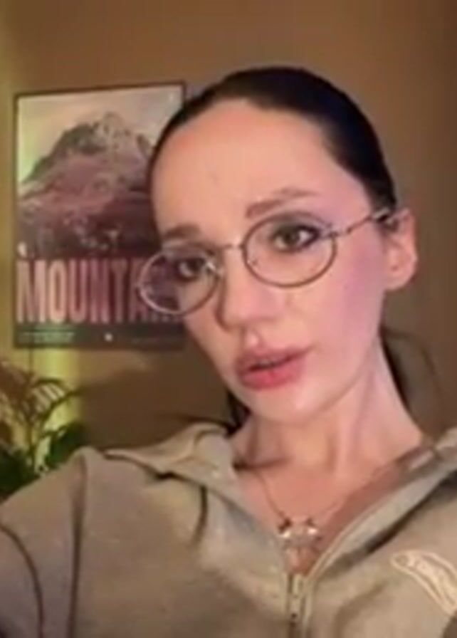 A woman with fair skin, round glasses, and dark hair pulled back into a ponytail is positioned in the center of the frame, facing forward and speaking