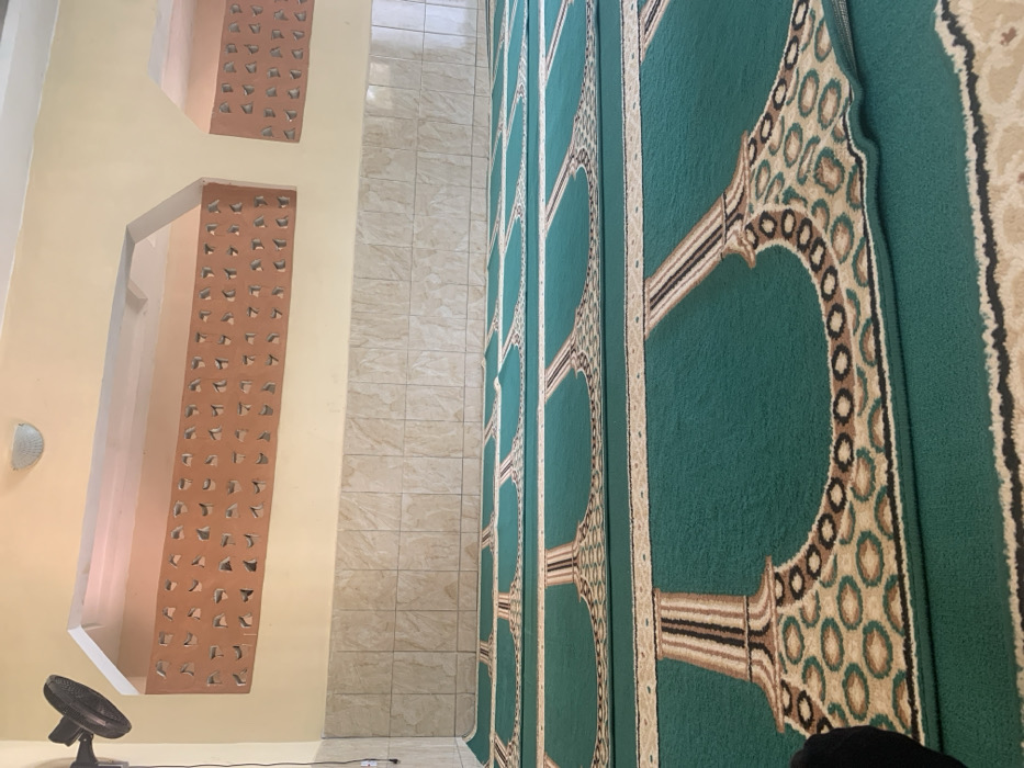 The image depicts the interior of a room, likely a prayer hall or mosque, characterized by its specialized floor covering and architectural features