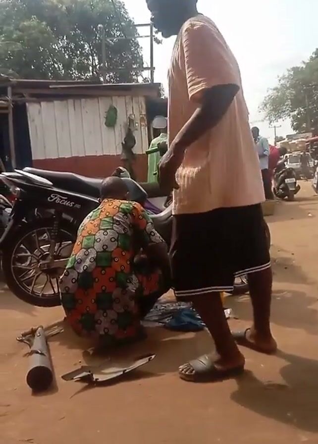 dusty, outdoor scene where a mechanic is working on a motorcycle. The mechanic, wearing a colorful patterned shirt and black pants, is crouched down next to a black and purple motorcycle. Various tools and parts are scattered on the ground around him, including a muffler, a metal plate, and a bowl. Another motorcycle, also black, is parked next to the one being worked on. A man wearing a peach-colored shirt and black shorts stands nearby, watching the mechanic. In the background, there is a small, corrugated metal building, trees, and other people. The camera is relatively stable, with some slight movements.