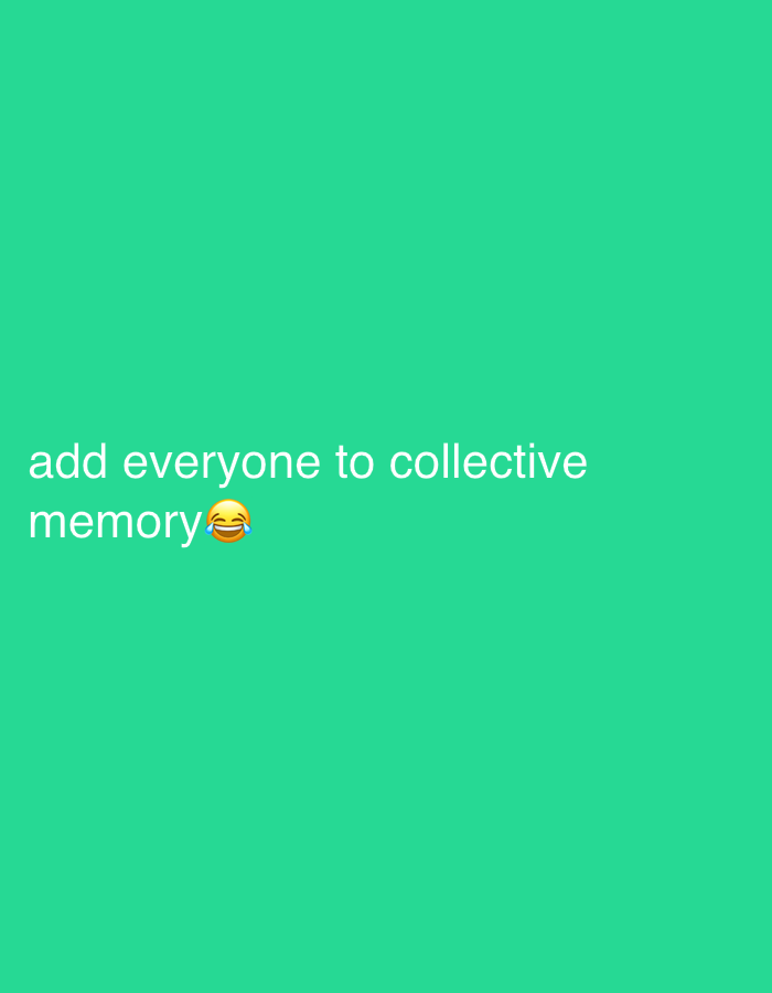 A light green background displays the text "add everyone to collective memory" with a slightly smiling face emoji with sweat drops coming from its left cheek
