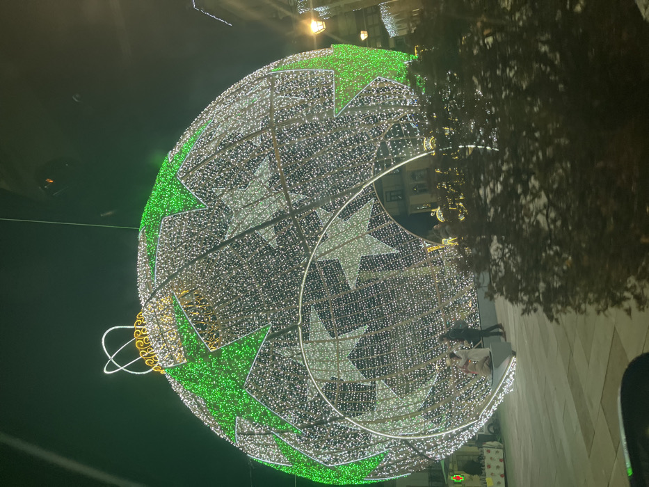 An oversized Christmas ornament in a town square dominates the scene. The ornament is constructed of wire and adorned with countless twinkling lights. Green lights outline the top and bottom and form star patterns. White lights fill the rest of the ornament. People are faintly visible behind the ornament, along with buildings and trees. The photo is taken at night.