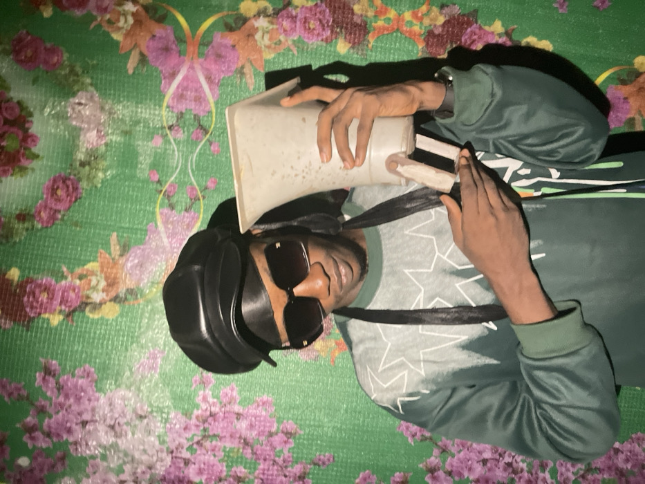 A person wearing a black leather cap and large black sunglasses reclines on a floral-patterned surface