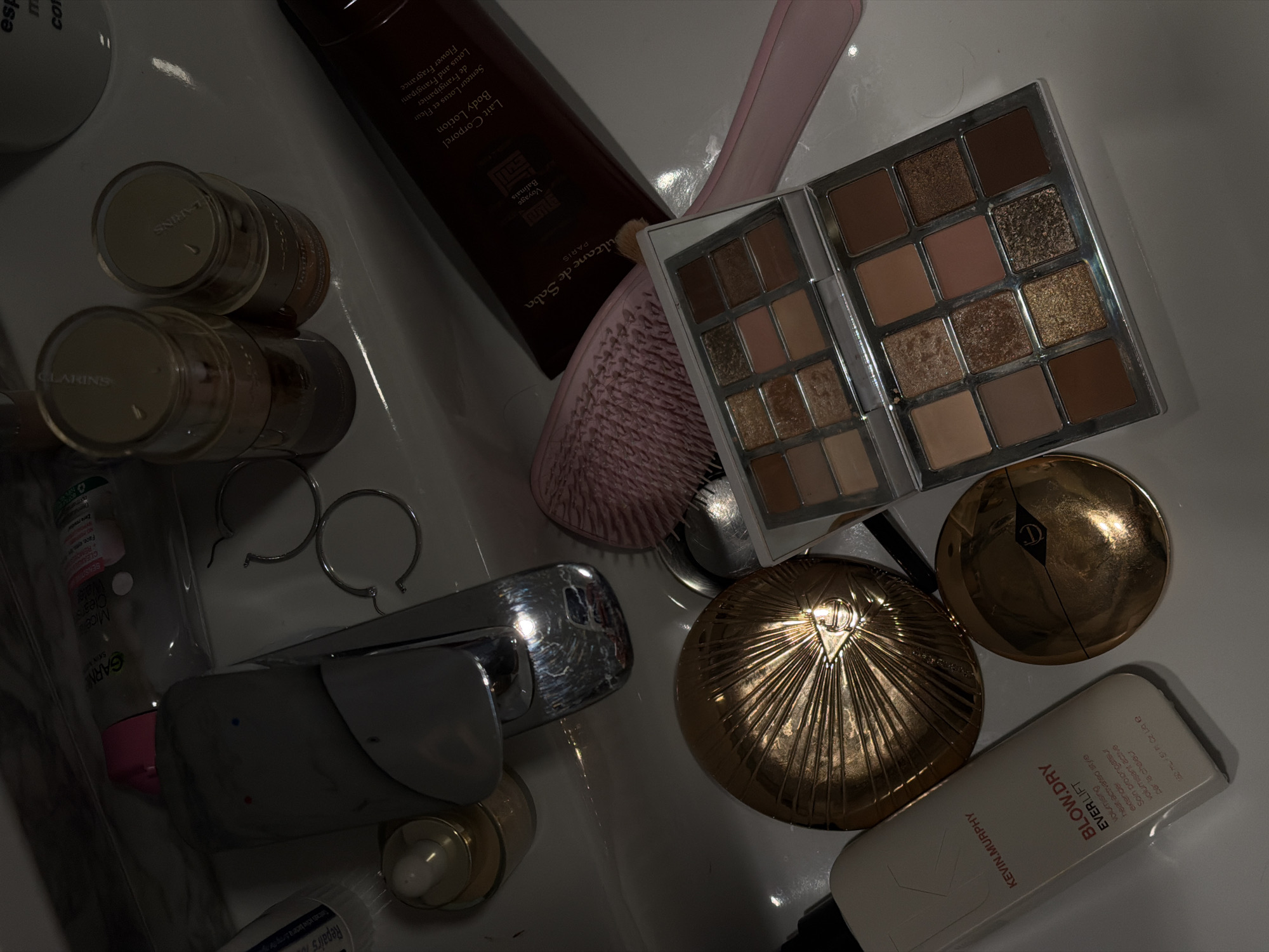 cluttered sink area, likely in a bathroom. The sink itself is white. Various cosmetic and personal care products are scattered around the sink. These items include two small jars labeled "CLARINS", a bottle of "Lait Corporel Body Lotion" by "Sultane de Saba Paris", a pink hairbrush, an eyeshadow palette, two round gold compacts, and a bottle of "KEVIN.MURPHY BLOW.DRY EVER.LIFT". There is also a bottle labeled "GARN". Also, a pair of hoop earrings. A silver faucet is visible. The lighting is dim, casting shadows across the scene. There is no evidence to determine if this image was taken in Budva, Montenegro.