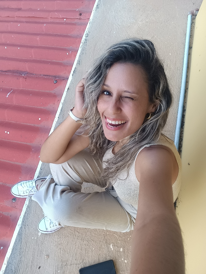 A female individual is depicted in a high-angle, downward-looking photograph, taken within the city of Trapiche del Medio, Venezuela. She is seated on a textured, light gray concrete surface, smiling broadly with her mouth open, revealing her teeth, and winking with her right eye. Her left hand is positioned near her left temple, fingers touching her wavy, light brown hair. She is wearing a light beige ribbed sleeveless top, matching ribbed pants, and white low-top sneakers with white laces. A white wristwatch is visible on her left wrist, and she wears small gold-colored hoop earrings. To the left of the subject, a weathered red corrugated metal roof extends diagonally into the background. To her right, a smooth, light yellow wall is visible, with a vertical light-colored pipe or conduit running along its seam with the concrete surface. A dark, rectangular electronic device rests on the concrete surface near her right foot.