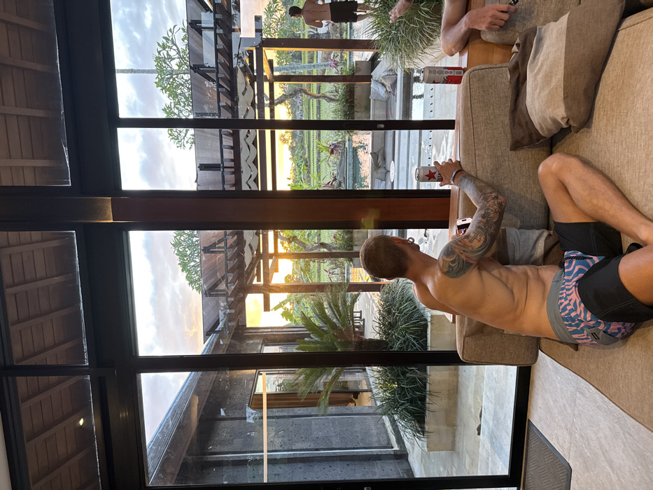 The image depicts an indoor space looking out onto an outdoor tropical setting at sunset in Mas, Indonesia. In the foreground, a male subject is seated shirtless on a light brown sofa, facing away from the viewer. He exhibits tattoos on his right arm and wears patterned swim trunks, holding a silver Bintang beer can in his right hand and a mobile phone in his left. To his immediate right, the lower legs and feet of a second individual are visible on the sofa, with another Bintang beer can placed beside them. The view through large, dark-framed glass windows reveals an outdoor area featuring a swimming pool surrounded by a light-colored patio and lush tropical vegetation, including a prominent palm-like plant. In the background, a third male subject, shirtless and wearing dark shorts, stands near the far edge of the swimming pool. Beyond the structured outdoor area, expansive green fields, consistent with rice paddies, extend towards the horizon under a sky displaying warm orange and yellow hues of a sunset. Modern dark-stone architectural elements and wooden pergolas are integrated into the outdoor environment.
