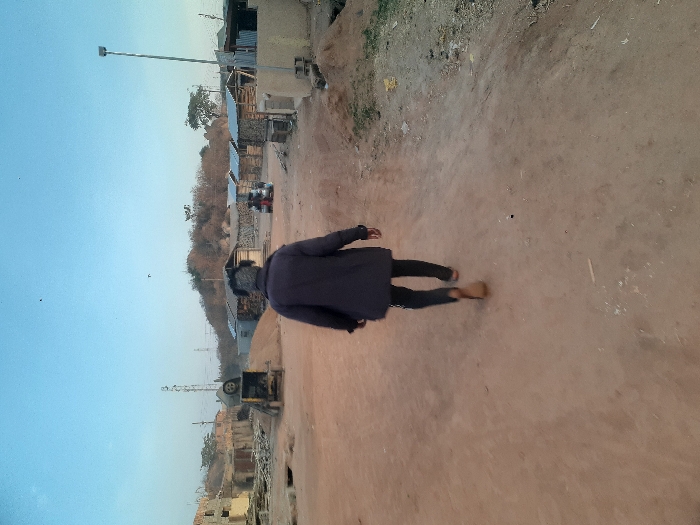 A street scene shows a person walking on a dirt road. They are facing away from the viewer, wearing a dark coat and pants, and barefoot. The road is dusty and brown. Buildings and foliage line the side of the road, appearing somewhat run-down. A light-blue sky is visible above. A lamppost stands tall in the background, and electrical wires are also seen.
