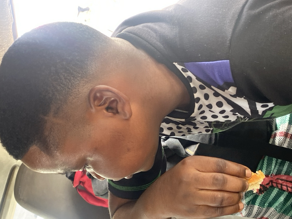 An individual, presumed male, with dark skin and a short, faded haircut featuring two carved lines forming a cross-like pattern on the left temple, is depicted in profile, looking right, inside a vehicle in Shagamu, Nigeria. The subject wears a dark long-sleeved garment, possibly a hoodie, over a white shirt with black polka dots and a purple segment, displaying a green cuff trim. The left hand of the individual holds a piece of light-colored, likely baked, food. The immediate environment includes a light-colored vehicle seat in the background, a partially visible red and grey bag, and green and white checkered fabric below the hand.