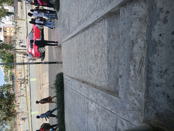 The scene is an elevated view of an urban outdoor environment, specifically a section of the University of Lagos campus in Akoka, Yaba, Lagos, Nigeria. The immediate foreground consists of three descending, weathered concrete steps leading to a flat concrete surface. This surface features two parallel raised concrete strips and exhibits numerous circular scuff marks and dark stains. A dark vertical pole is present on the left, partially obscured by a small patch of green shrubs. In the midground, an asphalt road runs horizontally. A red Hyundai SUV is parked curb-side, angled slightly towards the camera, facing right. To the right of the SUV, a group of approximately six individuals stands on the roadside pavement, in various casual attire. One individual, dressed in a dark blazer and carrying a backpack, stands facing away from the camera, positioned directly behind the red SUV. To the left, a separate group of three individuals walks leftwards along the roadside pavement, one carrying a backpack. The background reveals a large, open field, separated from the road by a low, grey concrete wall accented with green horizontal stripes and topped with a wire mesh fence. Approximately two dozen individuals, primarily young males, are distributed across this field, engaged in various activities consistent with informal sports or recreation. The field is bordered by several trees with sparse foliage. In the far distance, several multi-story buildings, characteristic of a university complex, are visible under bright daylight.
