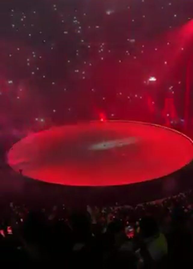 concert arena filled with people, focused on a large, circular stage in the center that is lit with red light. The stage is elevated, and a figure can be seen standing on it. Audience members are holding up their phones, seemingly recording the performance. The atmosphere is vibrant, with numerous lights shining around the arena and smoke rising from the stage area.