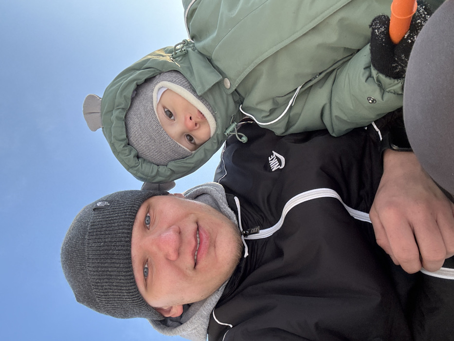 A close-up selfie-style photograph depicts two individuals, an adult male and a child, outdoors under a clear blue sky. The specific location within the city of Perm, Russia, is not discernible from the image. The adult male occupies the left and central portion of the frame. He has light skin, blue eyes, and a slight stubble on his chin and upper lip. He wears a dark grey knitted beanie with a light-colored logo, a grey hooded sweatshirt visible beneath a black windbreaker jacket featuring a white full-length zipper, white piping, and a white Nike swoosh logo on the left chest. His left hand, resting in the lower-left, shows a dark-colored smartwatch on the wrist. He is looking directly at the camera with a slight smile. To the right of the adult male is a young child, possibly a toddler. The child has light skin, dark eyes, and a neutral expression, also looking towards the camera. The child wears a light grey balaclava or hat under a sage green hooded winter suit, which features two small, light grey ear-like protrusions on the hood and white piping details. A dark-colored, possibly black, patterned glove is visible on the child's right hand, which holds a small, orange, rod-like object, possibly a part of a snow toy or sled handle. White specks, possibly snow, are visible on the child's glove. The background consists solely of a bright, cloudless blue sky, indicating daytime and clear weather conditions. Both individuals are dressed in winter attire.