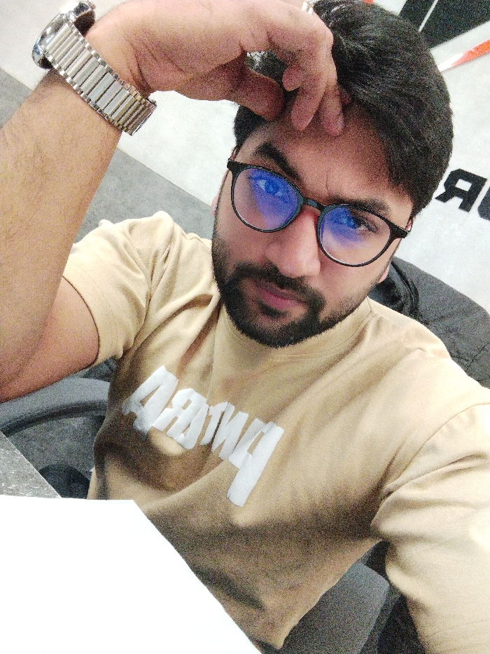 A person is captured in a selfie, angled from below. The individual has dark hair, a beard, and wears round glasses. A stainless steel wristwatch adorns their left wrist. They are wearing a beige shirt with a white logo that is partially obscured. The background features a gray surface, with some other objects and shapes, one of which is reversed. The person's left hand touches their forehead.